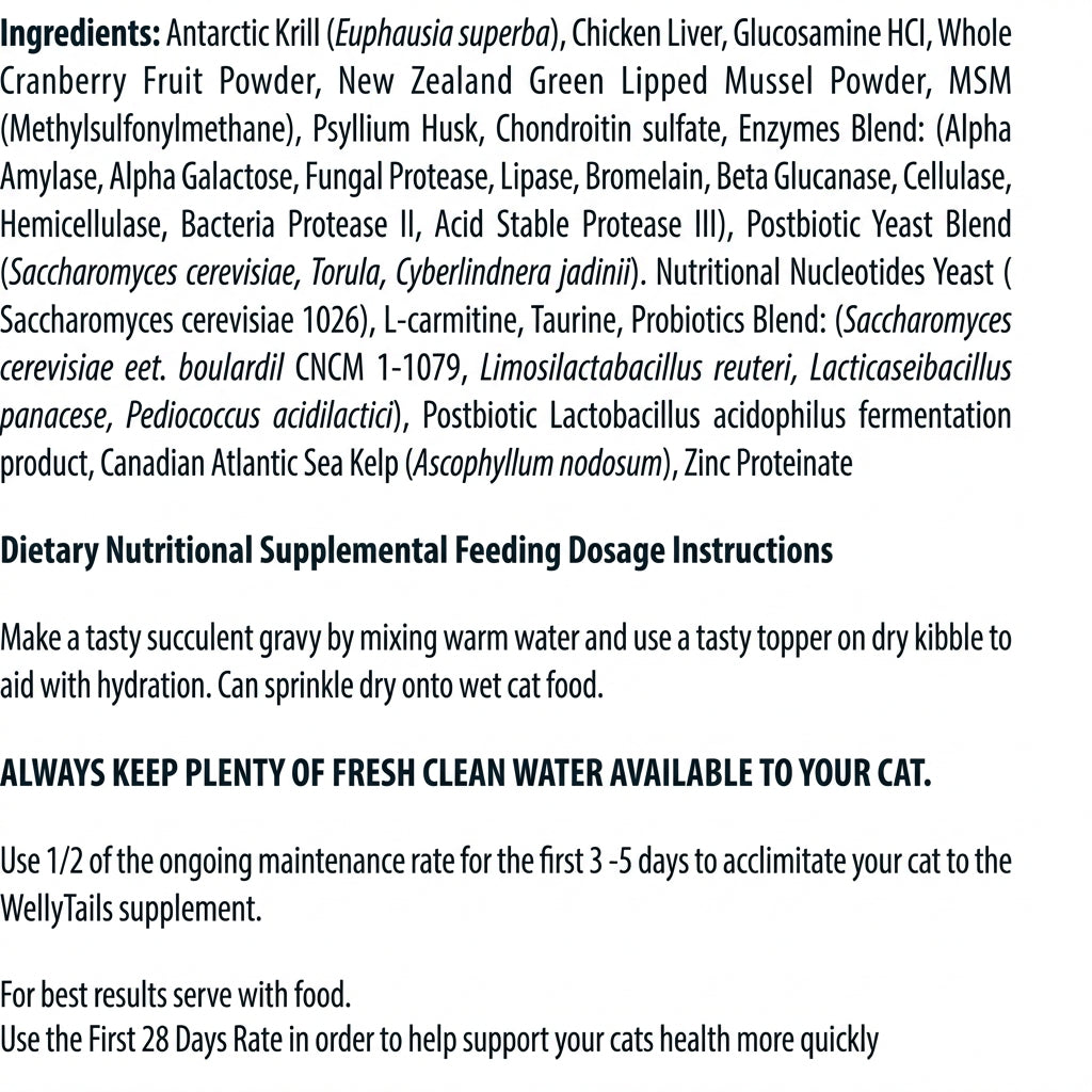 *It is recommended that you slowly introduce WellyTails Cat Supplement for the first 3 days to your cat’s diet. ONLY add ½ the amount of the recommended number of scoops of the “First 28 Days” rate FOR FIRST 3 DAYS. Begin counting the 28 days period after the initial 3 days of adding the ½ rate.