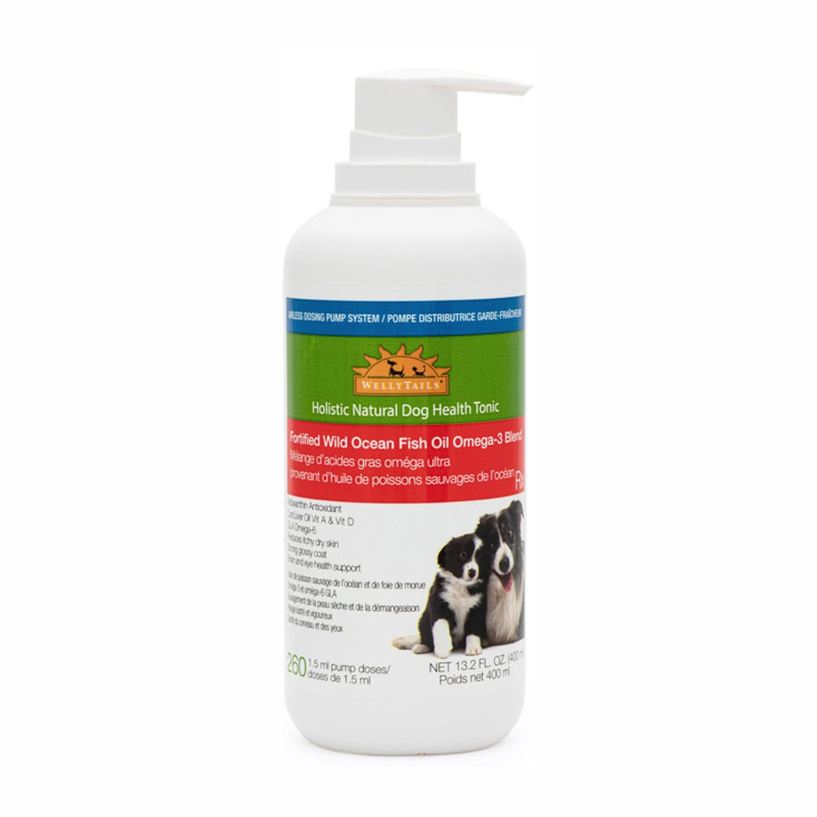 - ¿Su perro sufre de picazón en la piel seca, muda excesiva de pelo y/o pelaje opaco? Los aceites de pescado WellyTails Omega-3 suplemento de pescado para perros están especialmente mezclados para devolverle brillo al pelaje de su perro y al mismo tiempo reducir la caída y la picazón en la piel seca. Dado que se trata de un suplemento líquido, simplemente bombee una dosis en la comida de su perro y él lamerá su plato hasta dejarlo limpio.