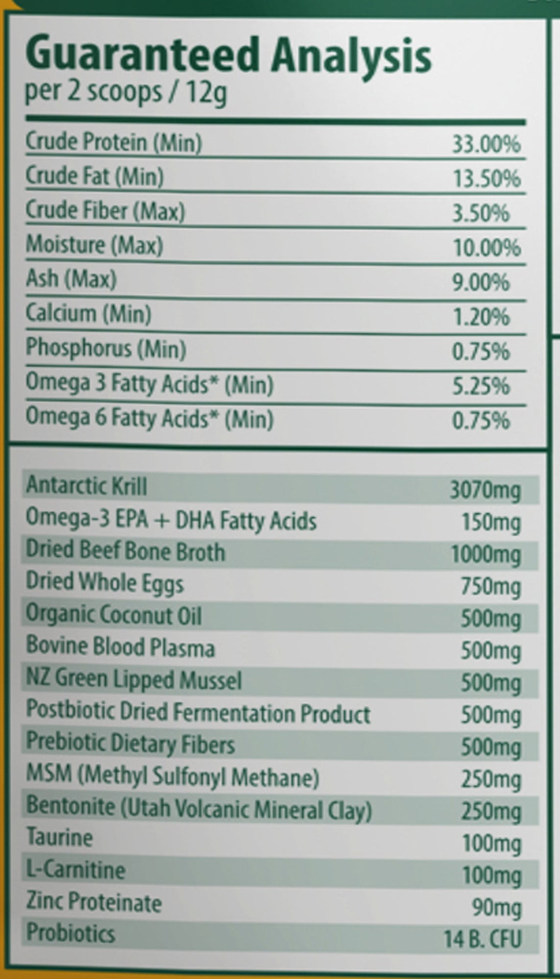- Skin + coat nutrients from omega-rich krill, kelp, and Vitamin E